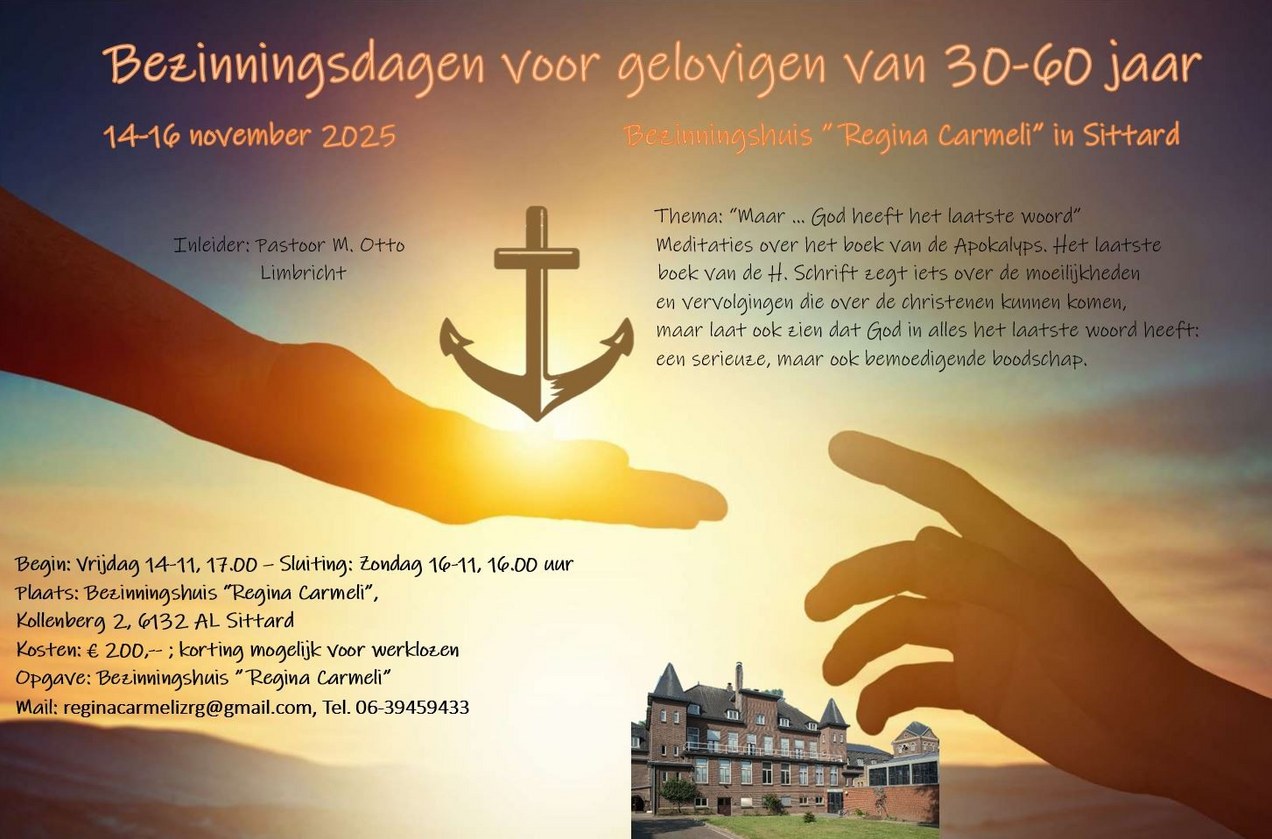 BezinningsweekendVan vrijdag 14 november 17:00 uur t/m 16 november 16:00 uur zijn er voor gelovigen van 30 tot 60 jaar inBezinningshuis “Regina Carmeli” in Sittard bezinningsdagen.Het thema is “Maar … God heeft het laatste woord”. Er zijn meditaties over het boek van de Apokalyps. Het laatste boek van de H. Schrift zegt iets over de moeilijkheden en vervolgingen die over de christenen kunnen komen, maar laat ook zien dat God in alles het laatste woord heeft: een serieuze, maar ook bemoedigende boodschap. De inleider is pastoor M. Otto uit Limbricht. De kosten voor het weekend zijn € 200,- (korting mogelijk voor werklozen). Aanmelden en meer informatie: Bezinningshuis ”Regina Carmeli”, Kollenberg 2, 6132 AL Sittard, telefoon 06-459433, reginacarmelizrg@gmail.com. |