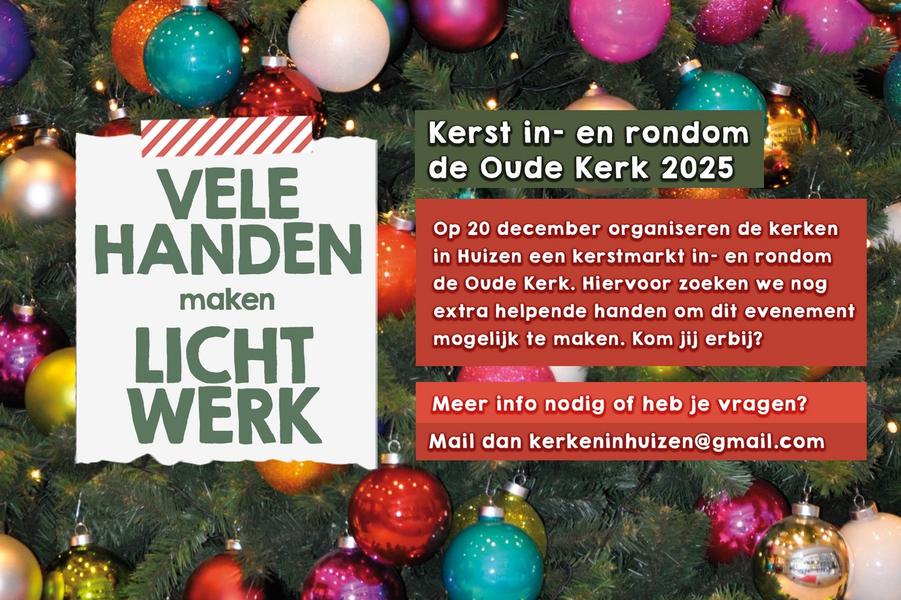 Hulp gevraagdNog maar een paar weken en dan is het weer Kerst! De kerken in Huizen slaan samen met de Gemeente Huizen de handen ineen om in december weer prachtige kerstactiviteiten te organiseren. En daar hebben we jouw hulp hard bij nodig! Op zaterdag 20 december, tussen 11.00 – 16.00 uur organiseren we weer de gezellige kerstmarkt in- en rondom de Oude Kerk met kraampjes, muziek, een knutselhoek, een fotowedstrijd en nog veel meer activiteiten. Ook dit jaar zijn we weer voornemens om een Pop-up Herberg te openen met een gezellige huiskamer waar men een kopje koffie kan krijgen en waar een mooie kerststallententoonstelling is. We hebben nog plek in de organisatiegroep en we hebben jou er graag bij. Ben jij ook: – Gepassioneerd over de kerstperiode; – Gepassioneerd voor het interkerkelijk samenwerken; – Bereid om samen de verantwoordelijkheid te dragen voor de organisatie; – Beschikbaar om één avond in de maanden oktober, november en december te vergaderen? Kom jij ook bij de organisatiegroep? Mail dan naar kerkeninhuizen@gmail.com. We komen graag met je in contact. Wil je niet in de organisatie maar wel meewerken op de dag zelf? Dan kan je het formulier invullen op www.kerstinhuizen.nl en ontmoeten we je graag op de dag zelf. |