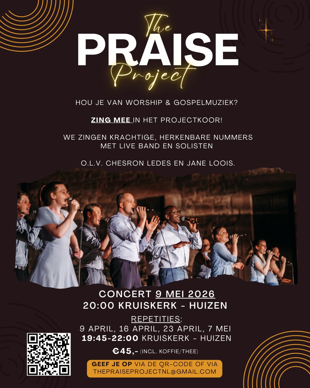 Praise projectThe Praise Project is een avond vol krachtige en herkenbare gospel- en aanbiddingsnummers die je raken en je bijna automatisch laten meezingen. Houd je van deze muziek? Zing dan mee in het projectkoor, dat krachtige, herkenbare nummers met live band en solisten zingt. Het koor is onder leiding van Chesron Ledes en Jane Loois. Of je nu ervaren bent of gewoon enthousiast: Je bent van harte welkom!. Repetities: donderdag 9, 26, 23 april en 7 mei 19:45-22:00 uur in de Kruiskerk in Huizen. Het concert is op zaterdag 9 mei. De kosten zijn € 45,- inclusief koffie en thee. Aanmelden via thepraiseprojectnl@gmail.com. |