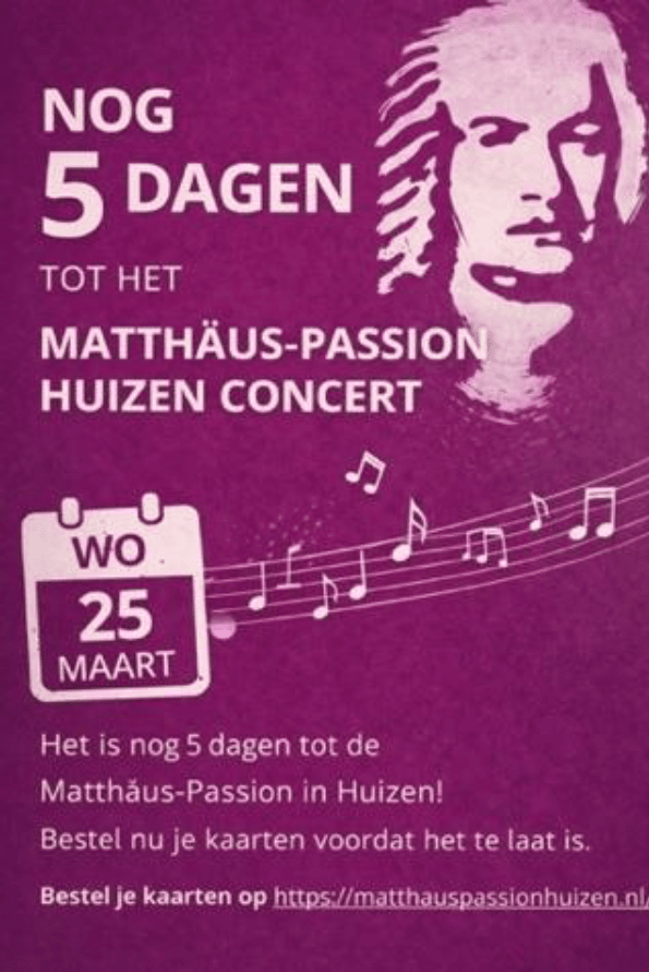 Matthäus Passion in de Nieuwe Kerk De uitvoering van de Matthäus Passion komt nu echt dichtbij: het concert vindt plaats op woensdag 25 maart in de Nieuwe Kerk om 19.30 uur. Bij de audities zag Willemien den Hollander het al: “Er is veel energie en enthousiasme bij de koorleden”. Ook vanuit de parochie wordt er meegezongen! De uitzonderlijke kwaliteit van de uitvoering – die vorig jaar veel complimenten kreeg – is wat de Huizer Passion onderscheidt van de rest. Kaarten a € 45,00 (vanaf 25 jaar) en € 25,00 (tot 25 jaar) zijn verkrijgbaar via https://matthauspassionhuizen.nl. |